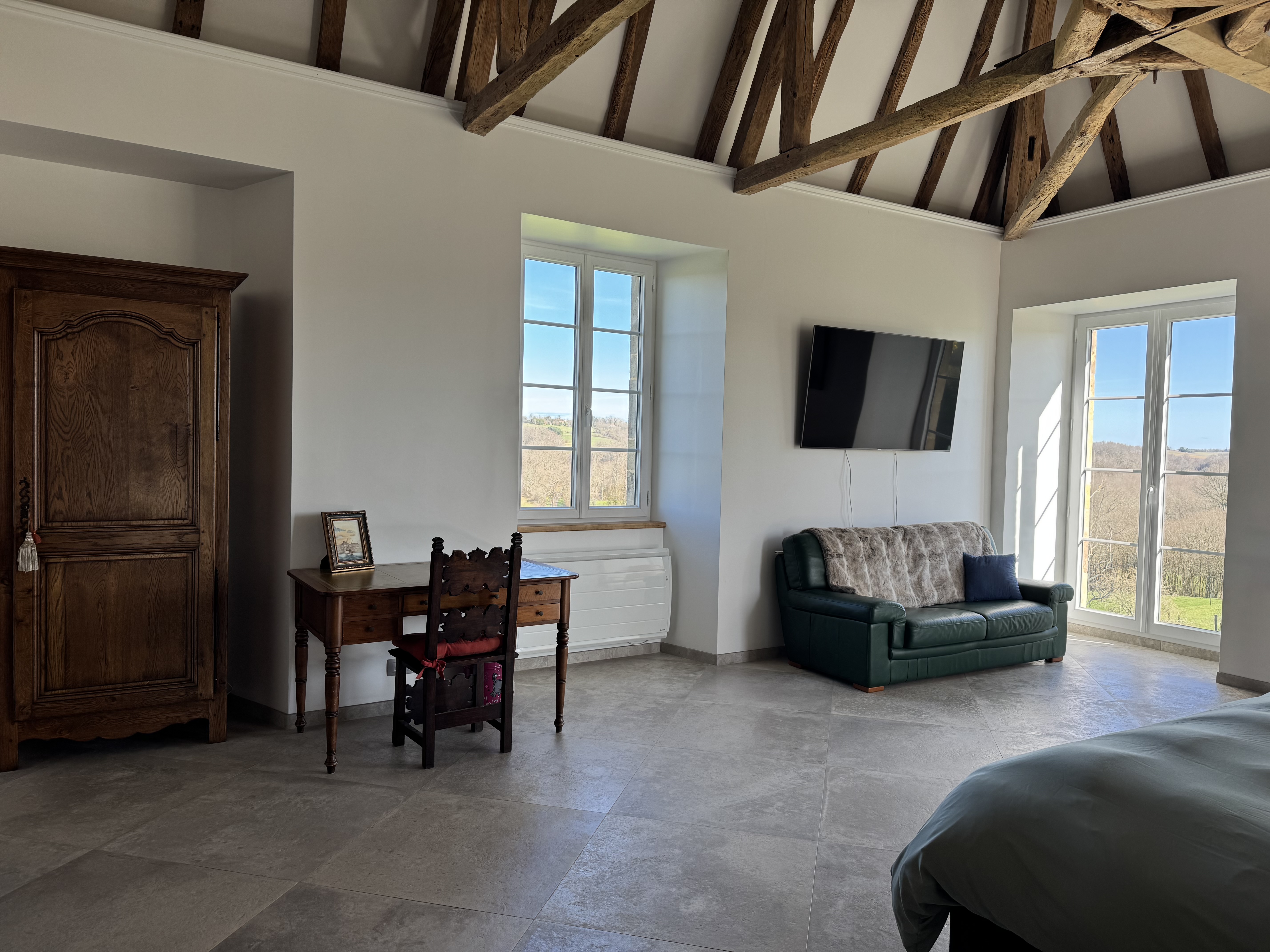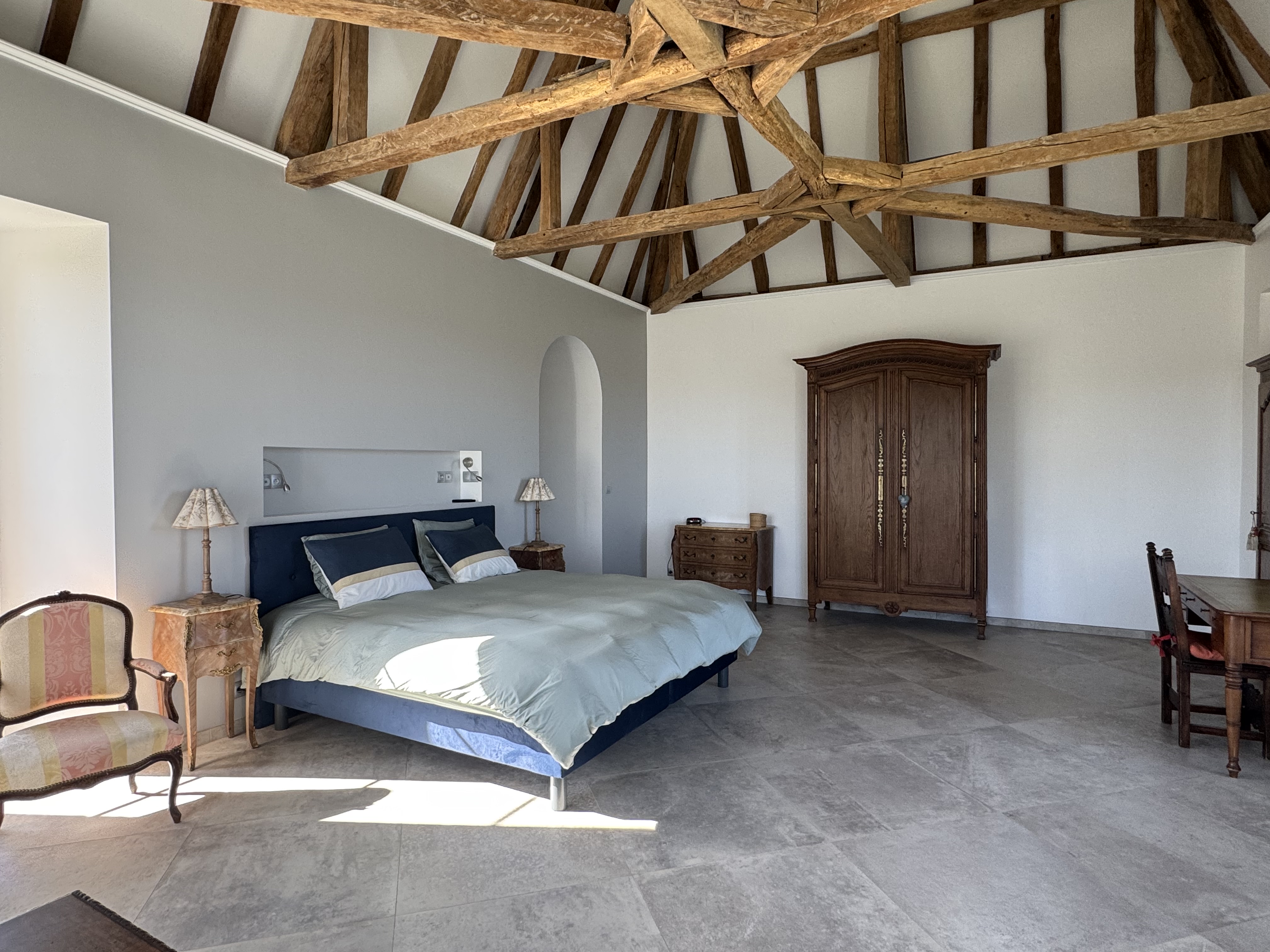 The suite features an entrance on the second floor, one bathroom and the main room under the magnificent roof structure of the east tower.
